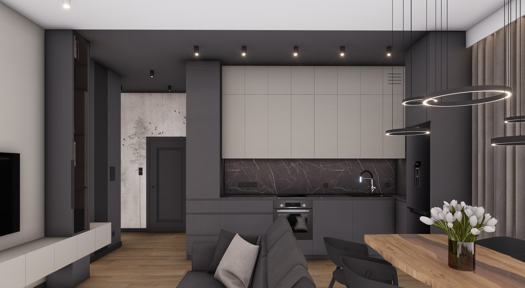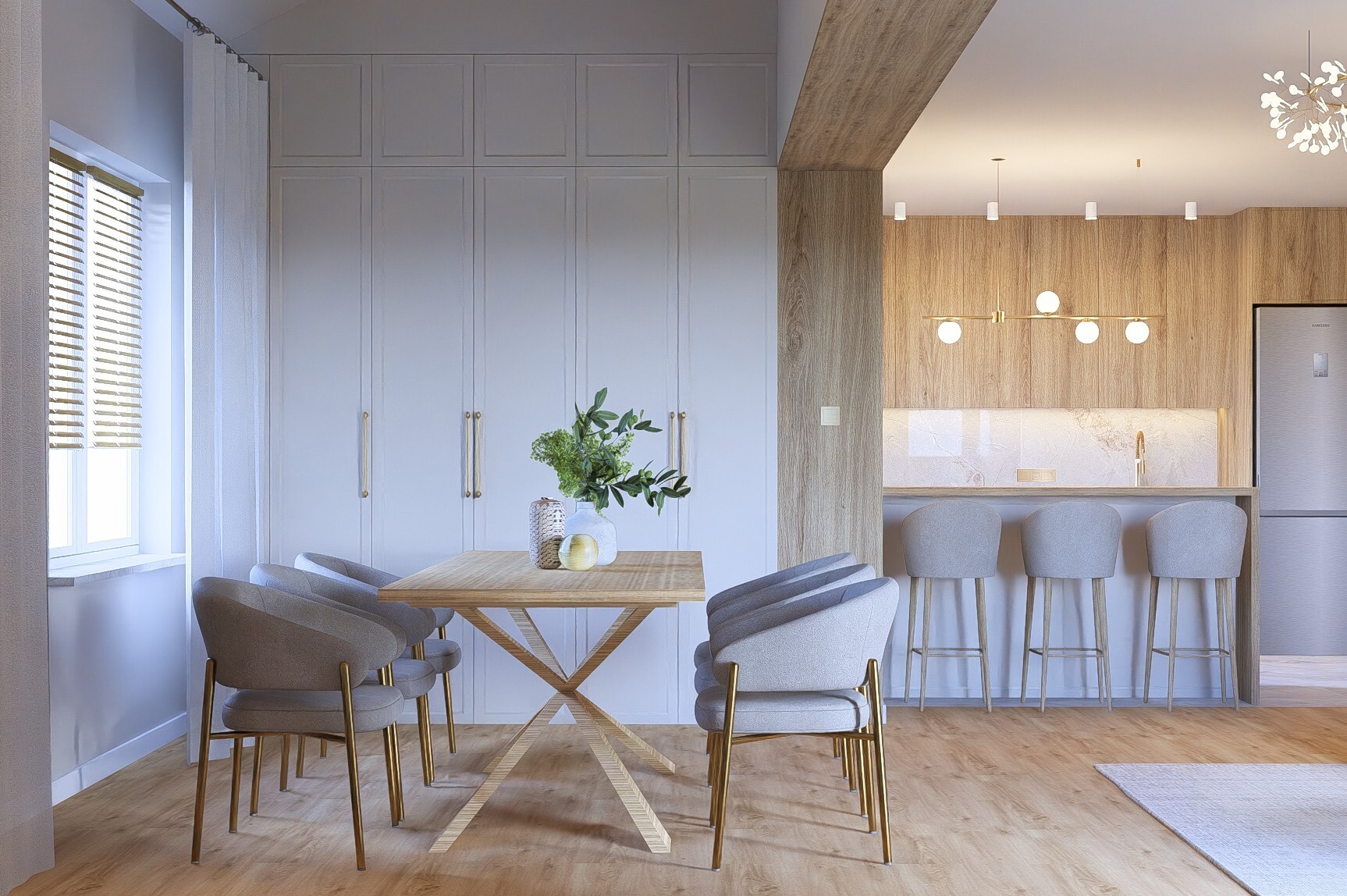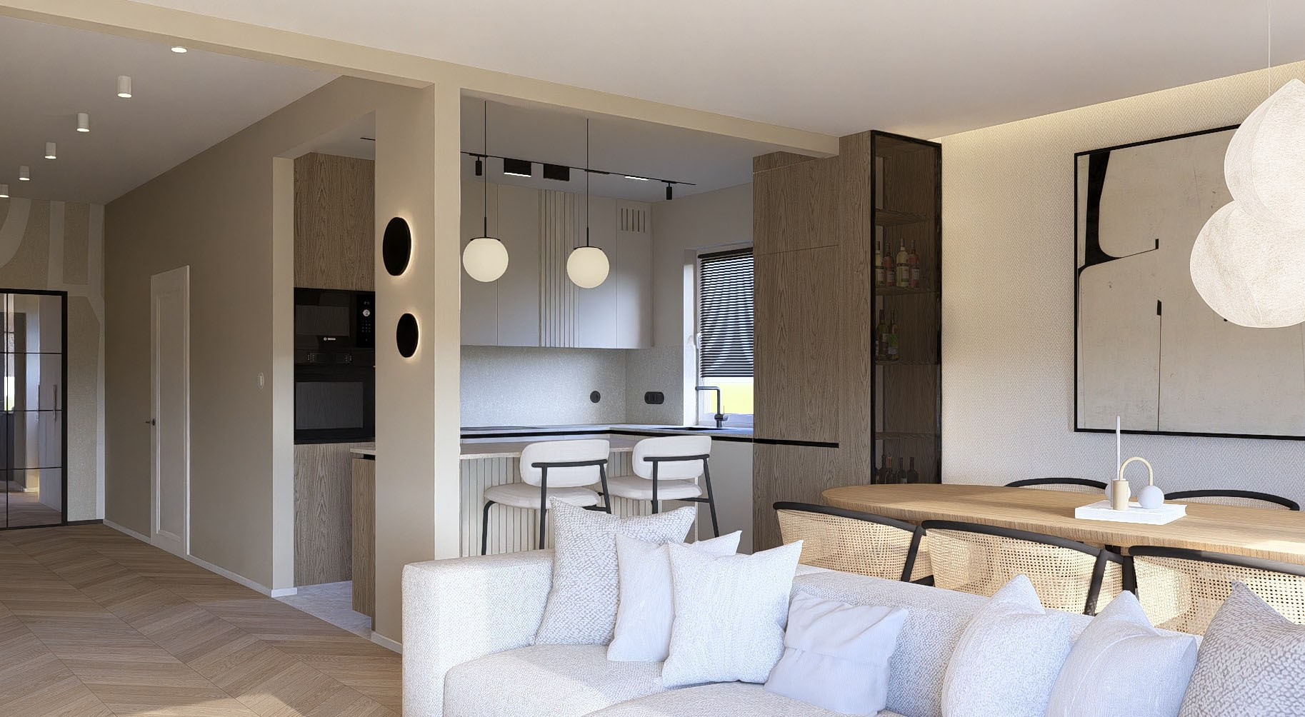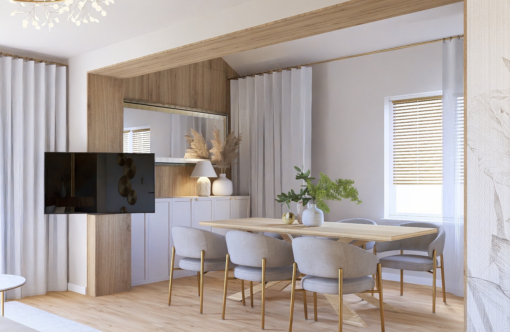 Koncepcja salonu z kuchnią, jadalni, wiatrołapu i korytarza w domu jednorodzinnym w Bielsku Podlaskim