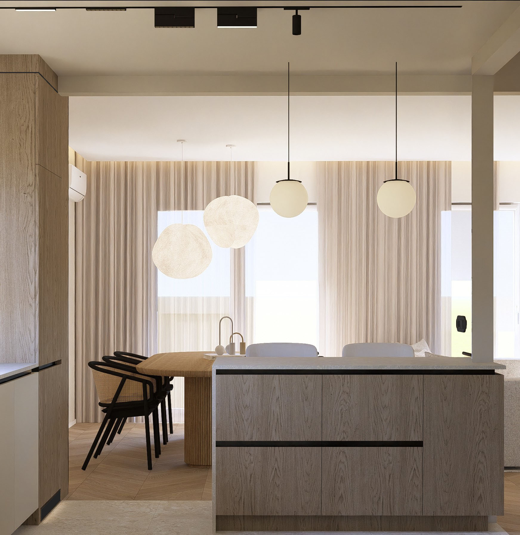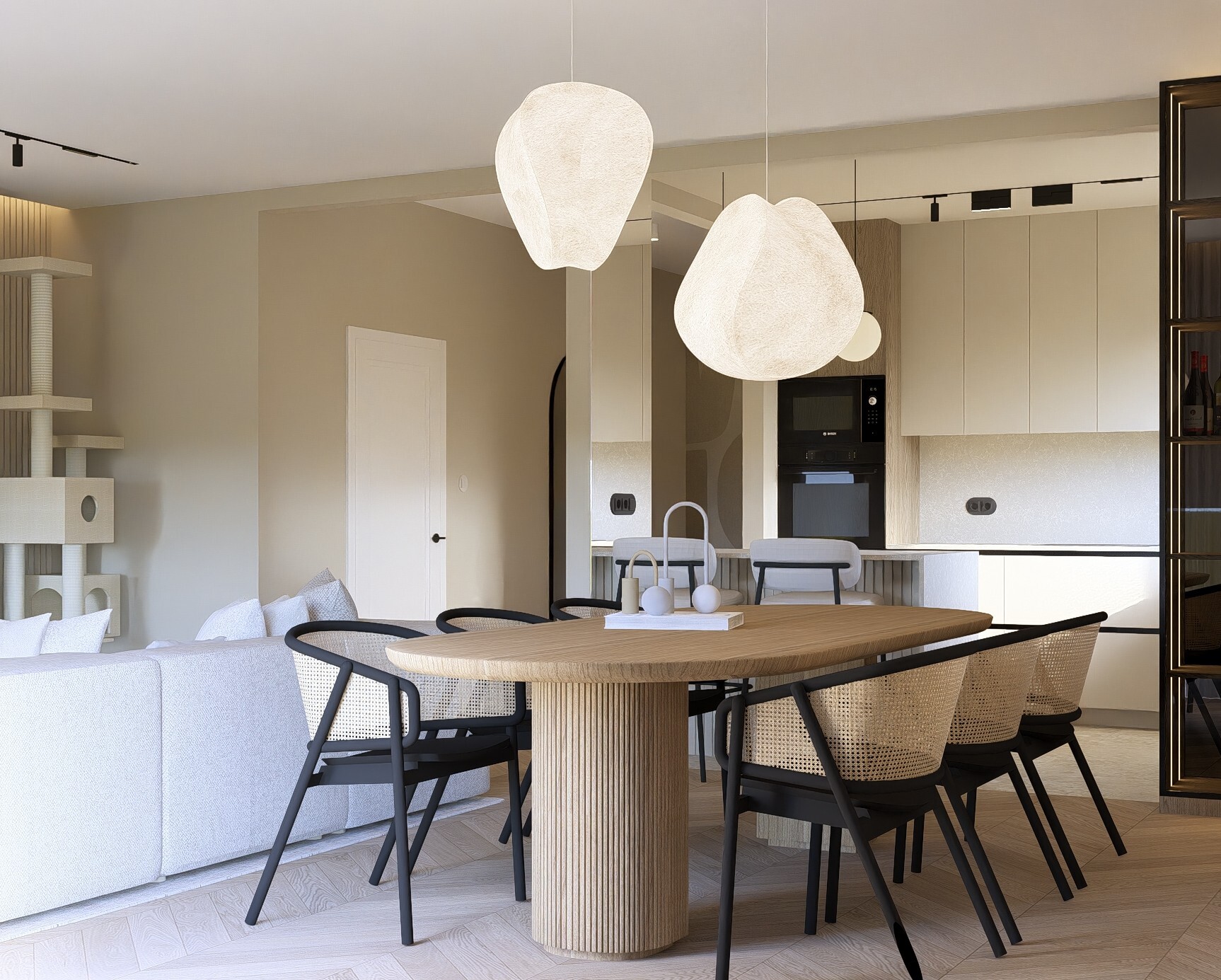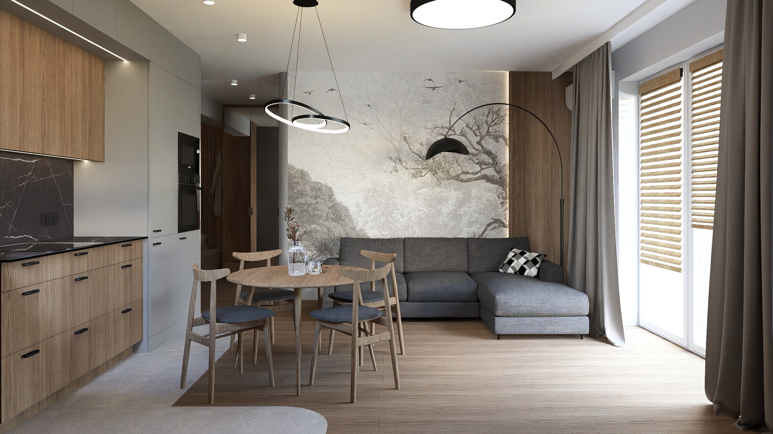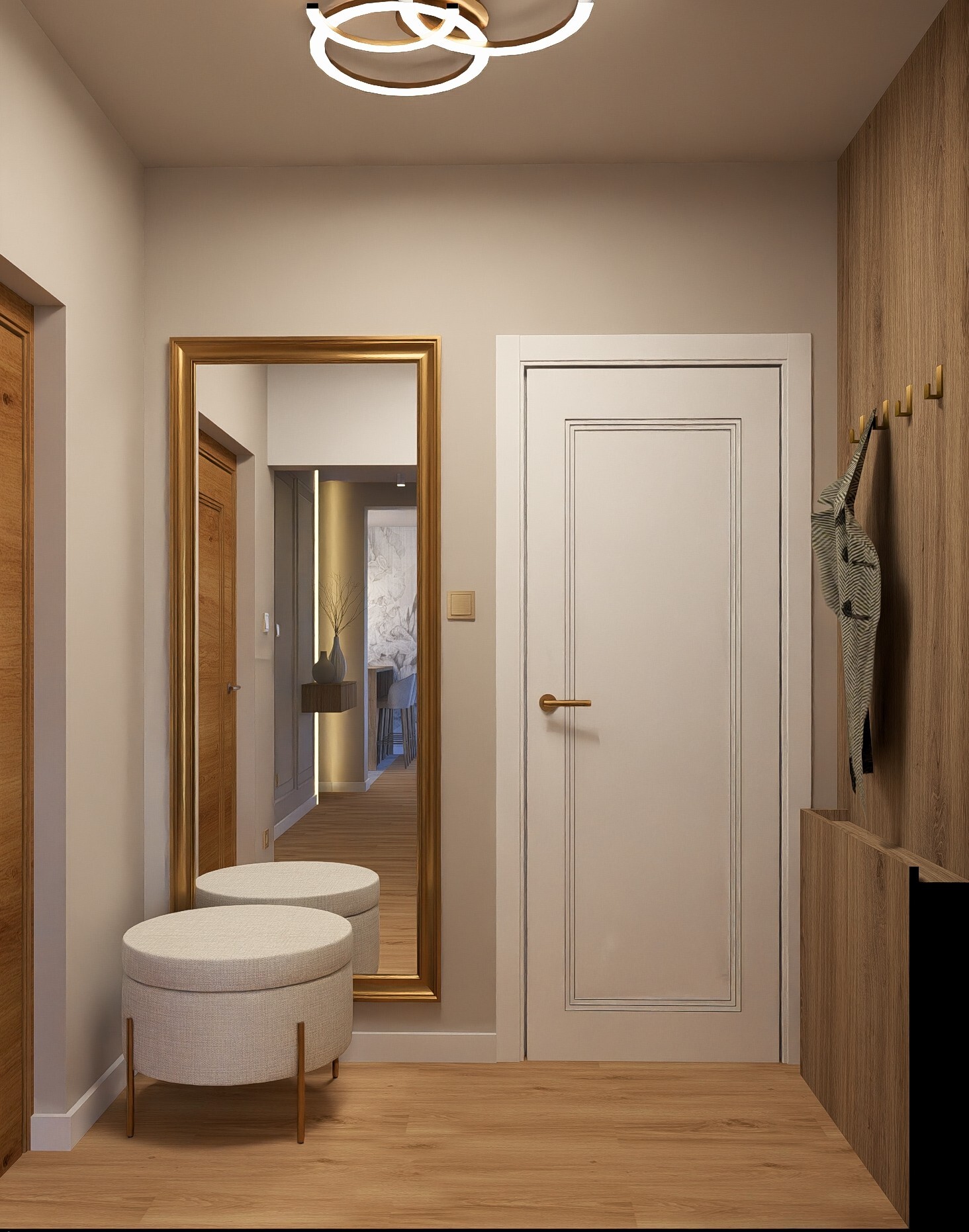 Koncepcja salonu z kuchnią, jadalni, wiatrołapu i korytarza w domu jednorodzinnym w Bielsku Podlaskim