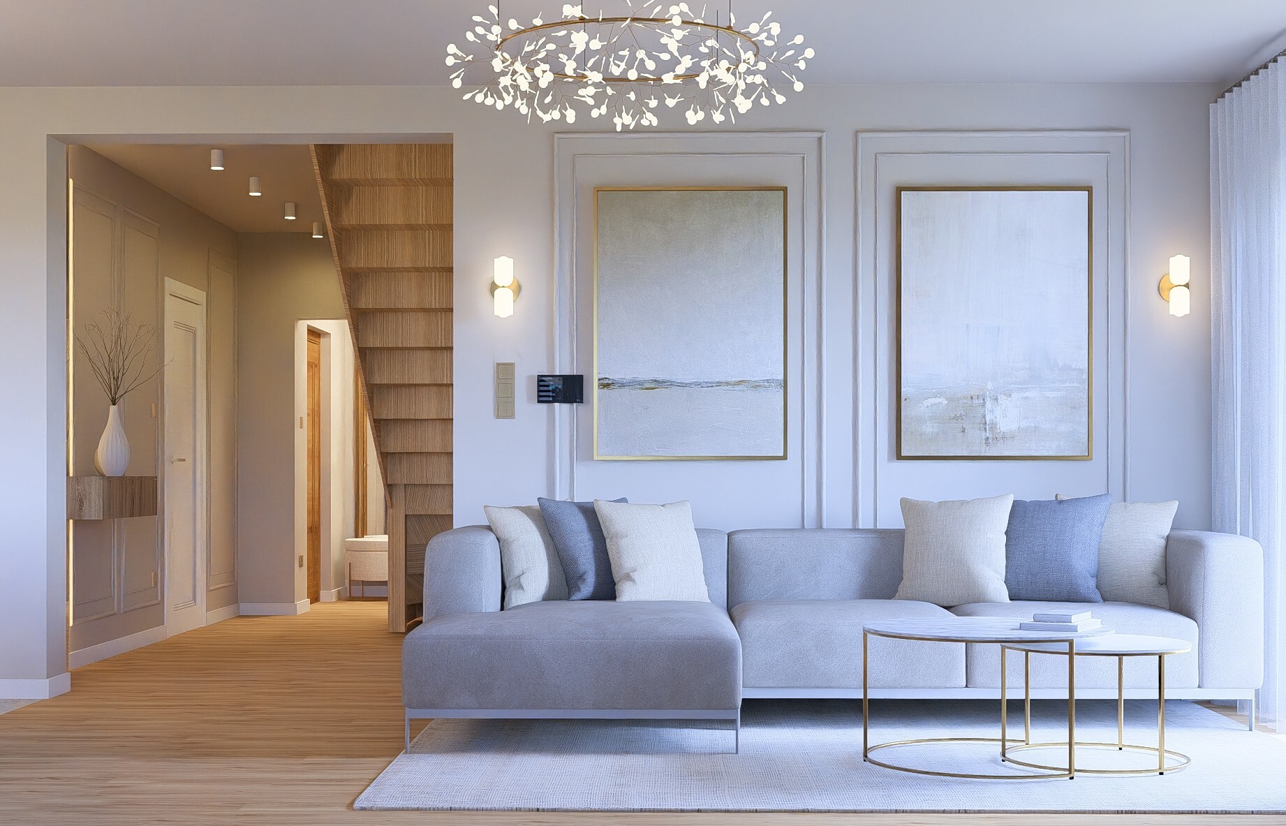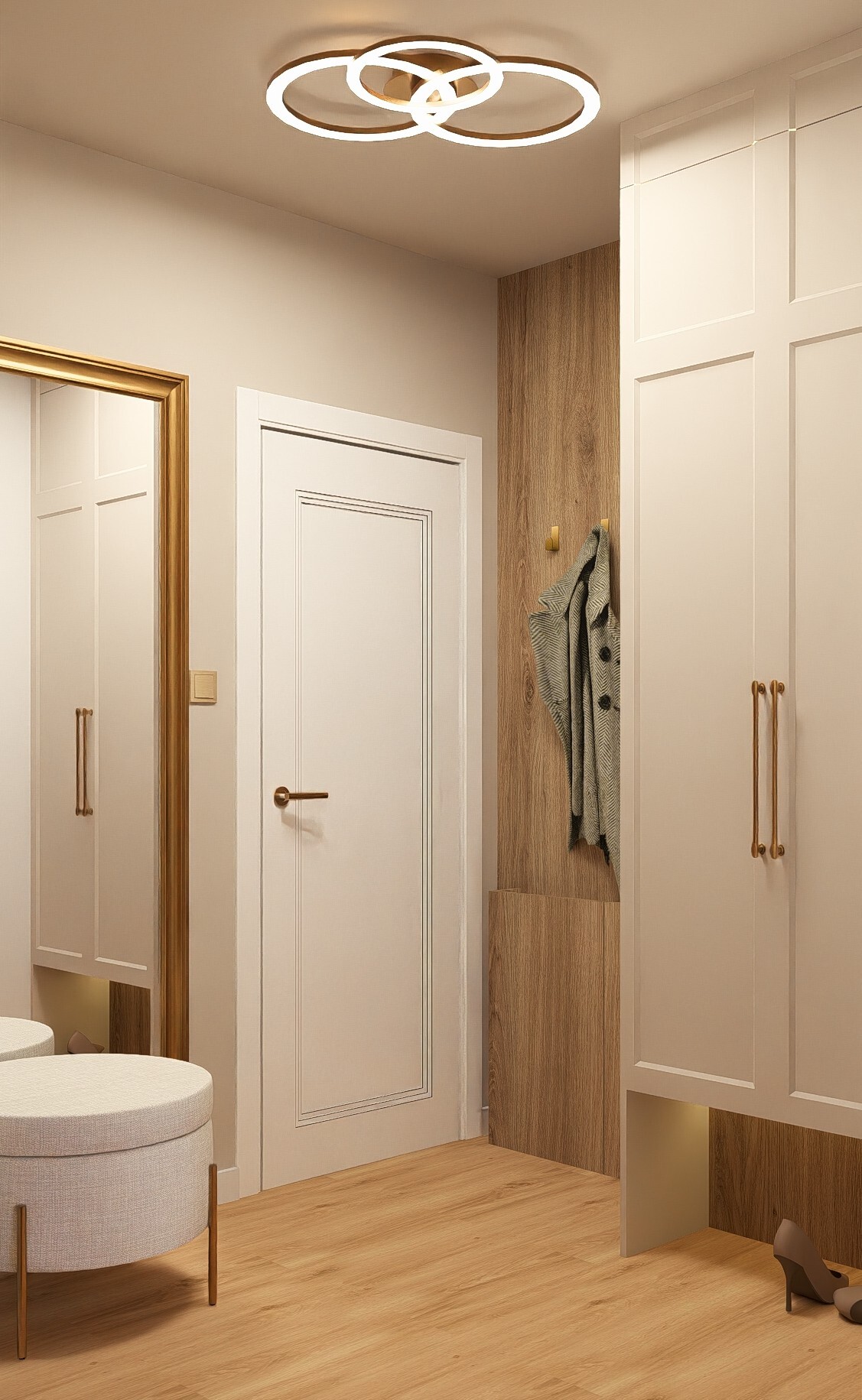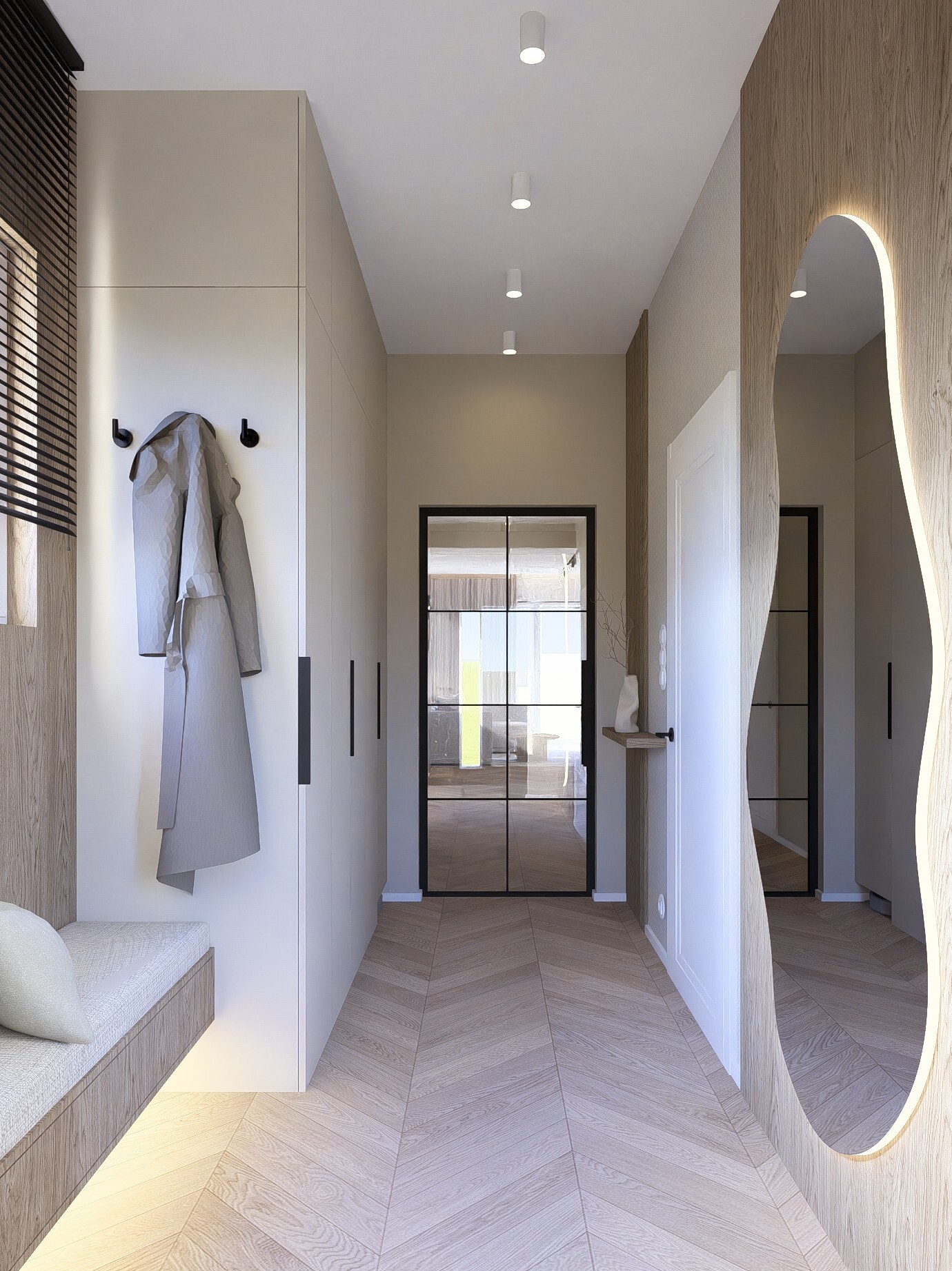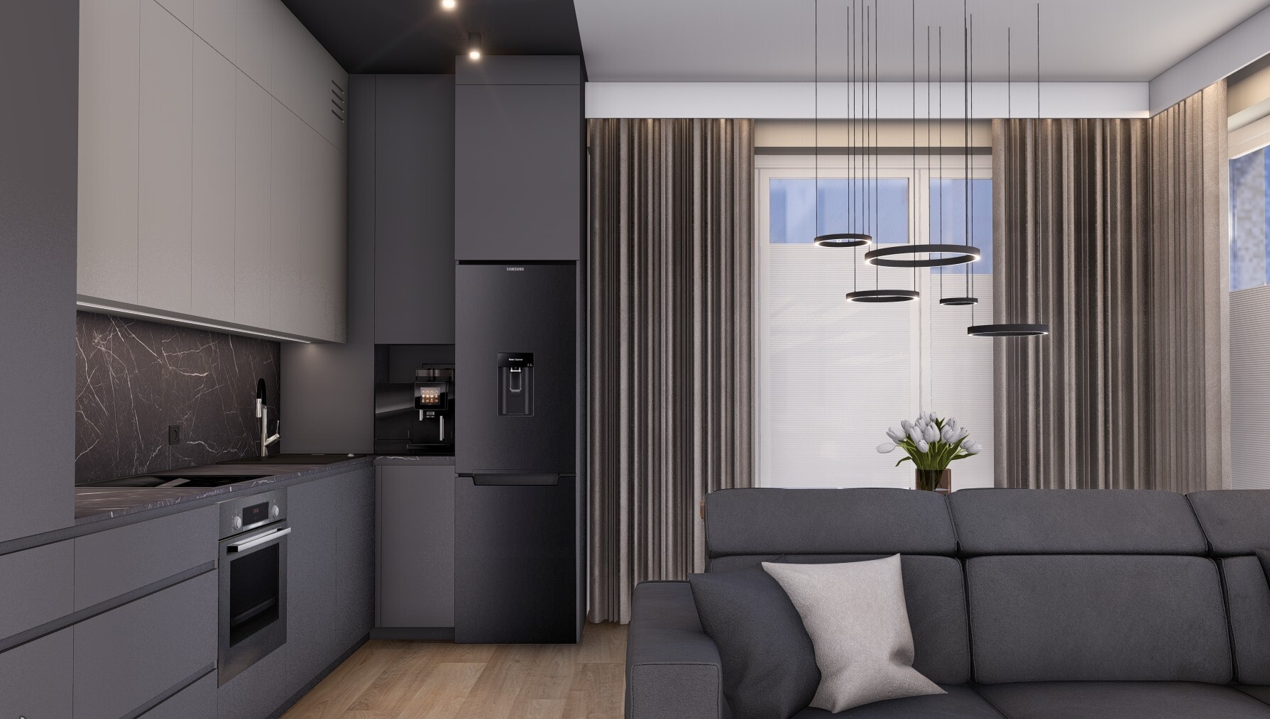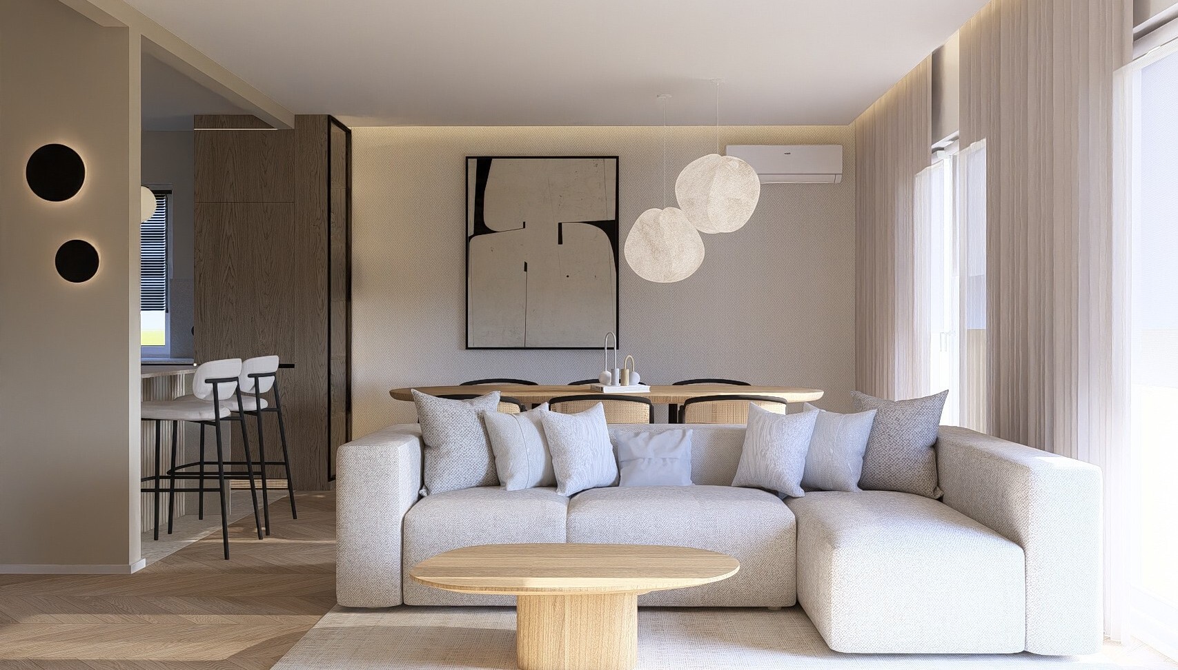 Koncepcja salonu z kuchnią, jadalni, wiatrołapu i korytarza w domu jednorodzinnym w Bielsku Podlaskim
