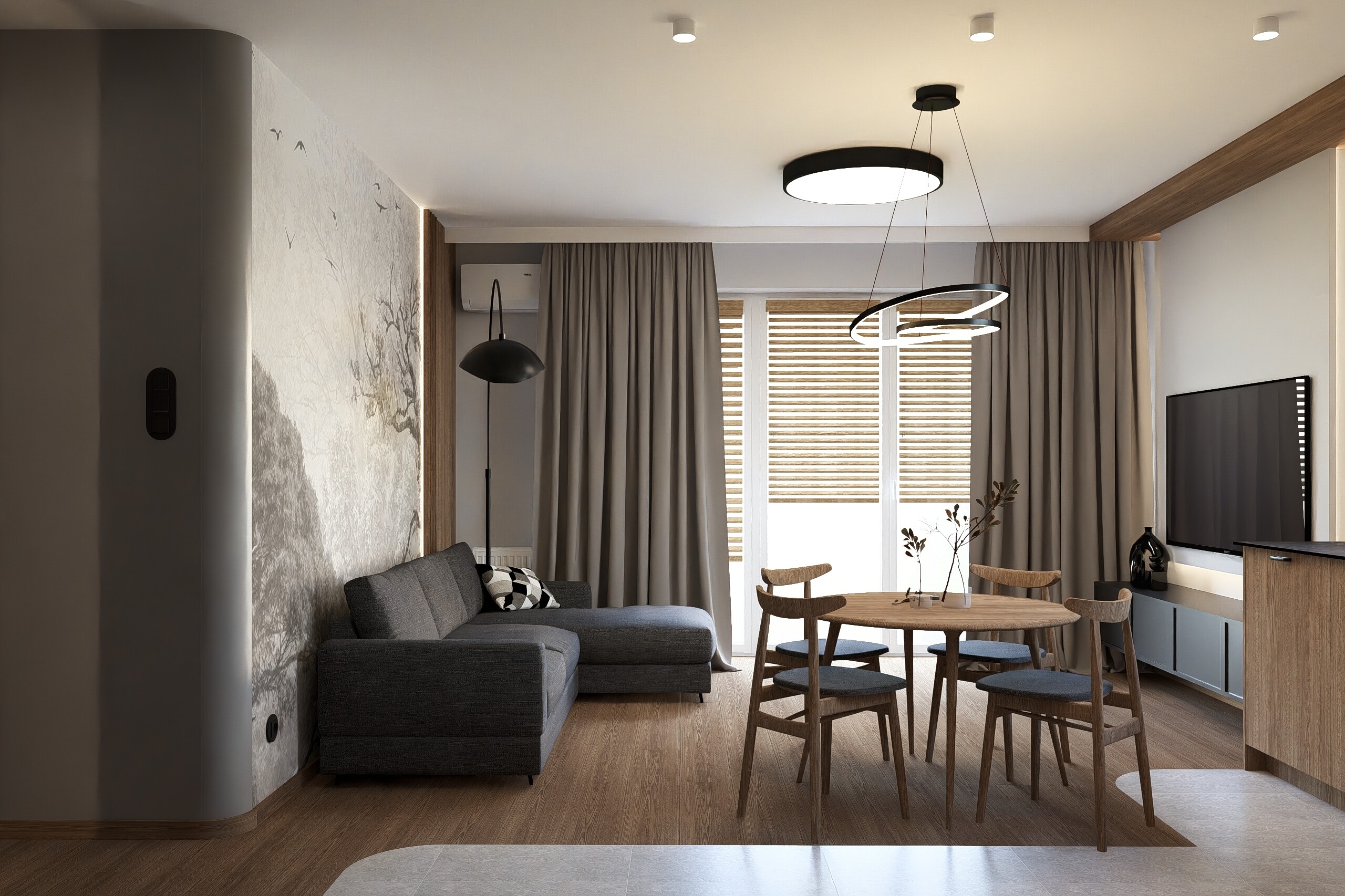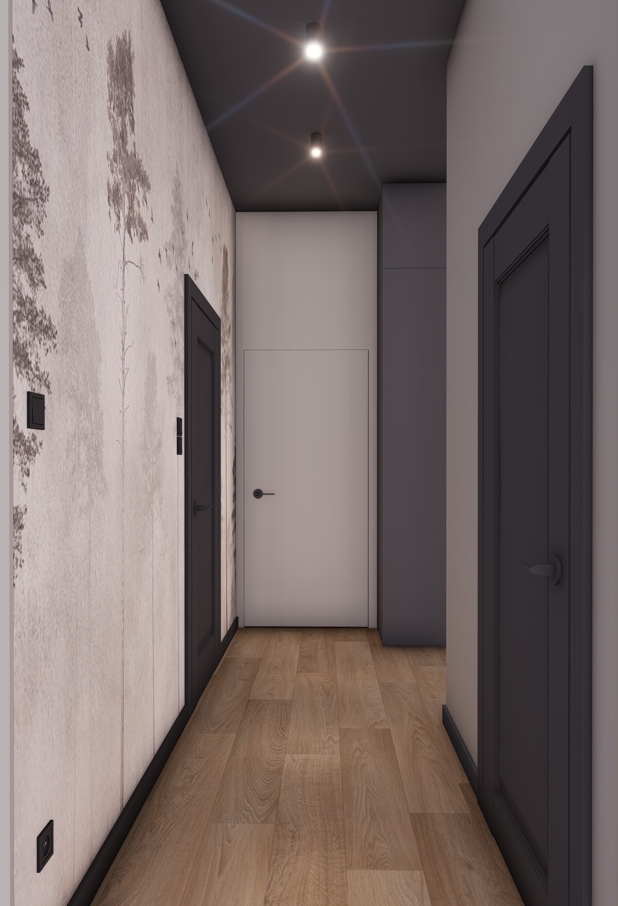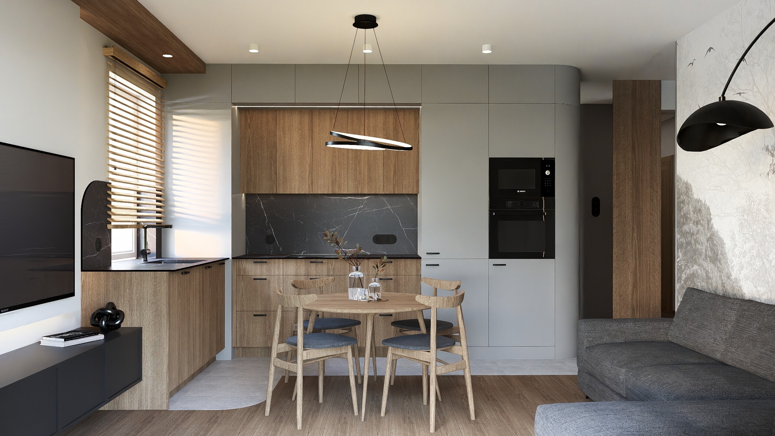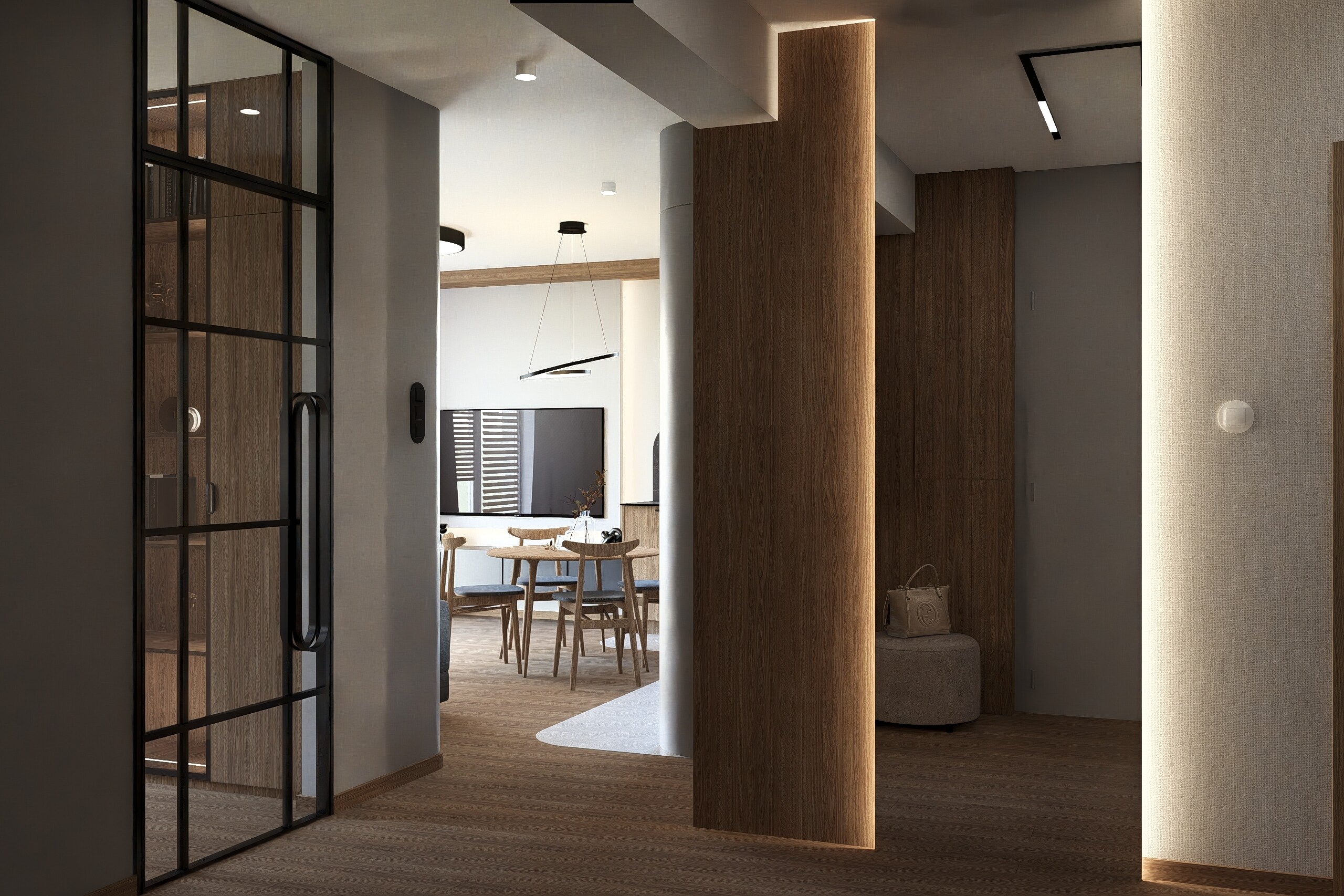 Koncepcja salonu z kuchnią, jadalni, wiatrołapu i korytarza w domu jednorodzinnym w Bielsku Podlaskim