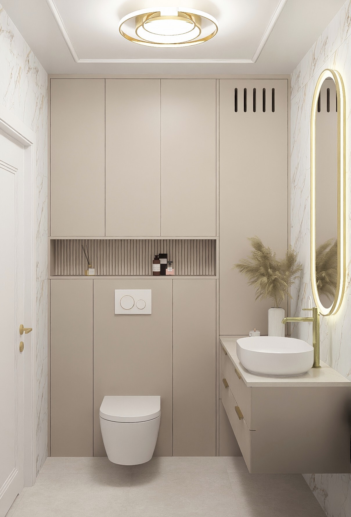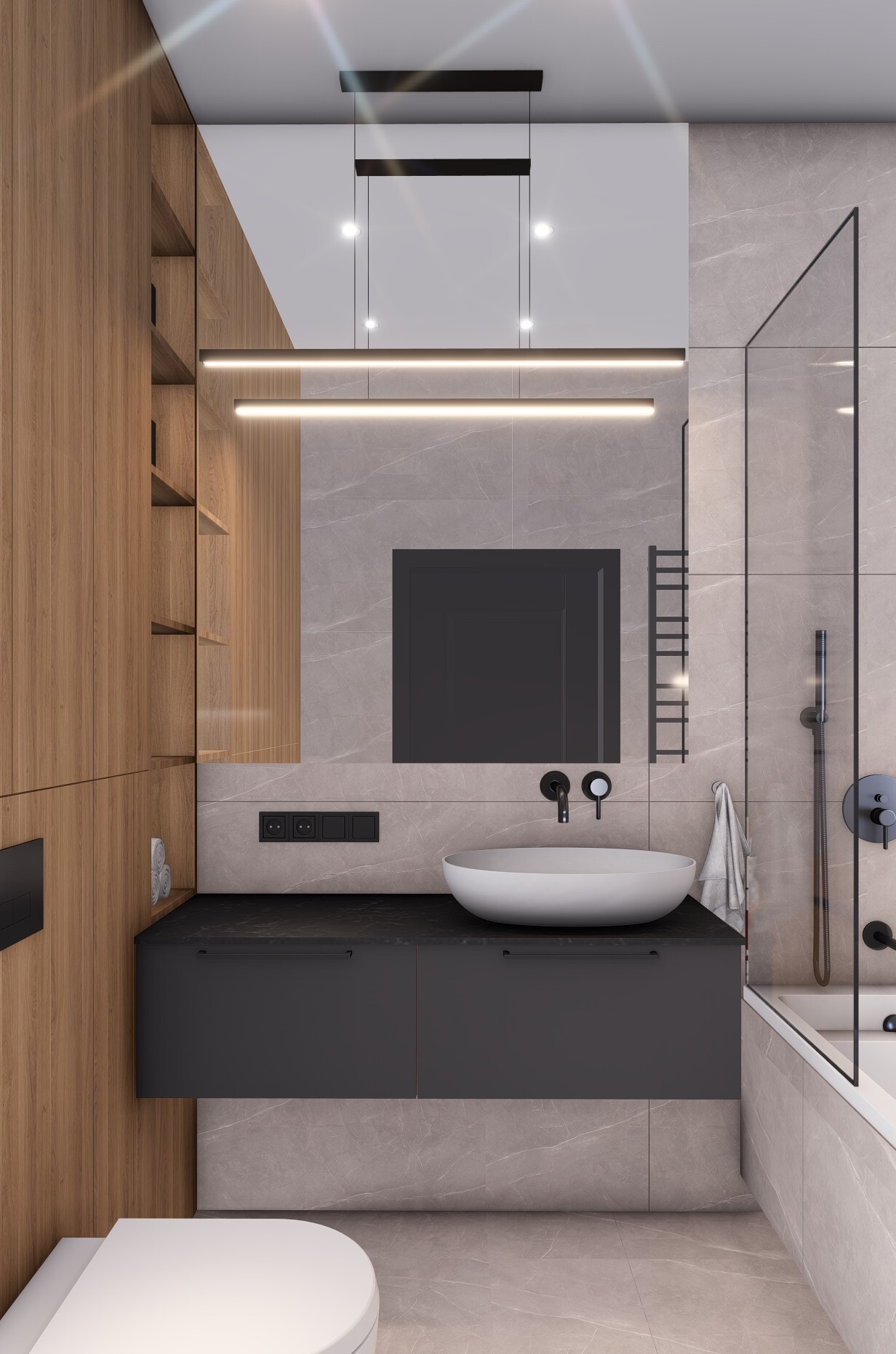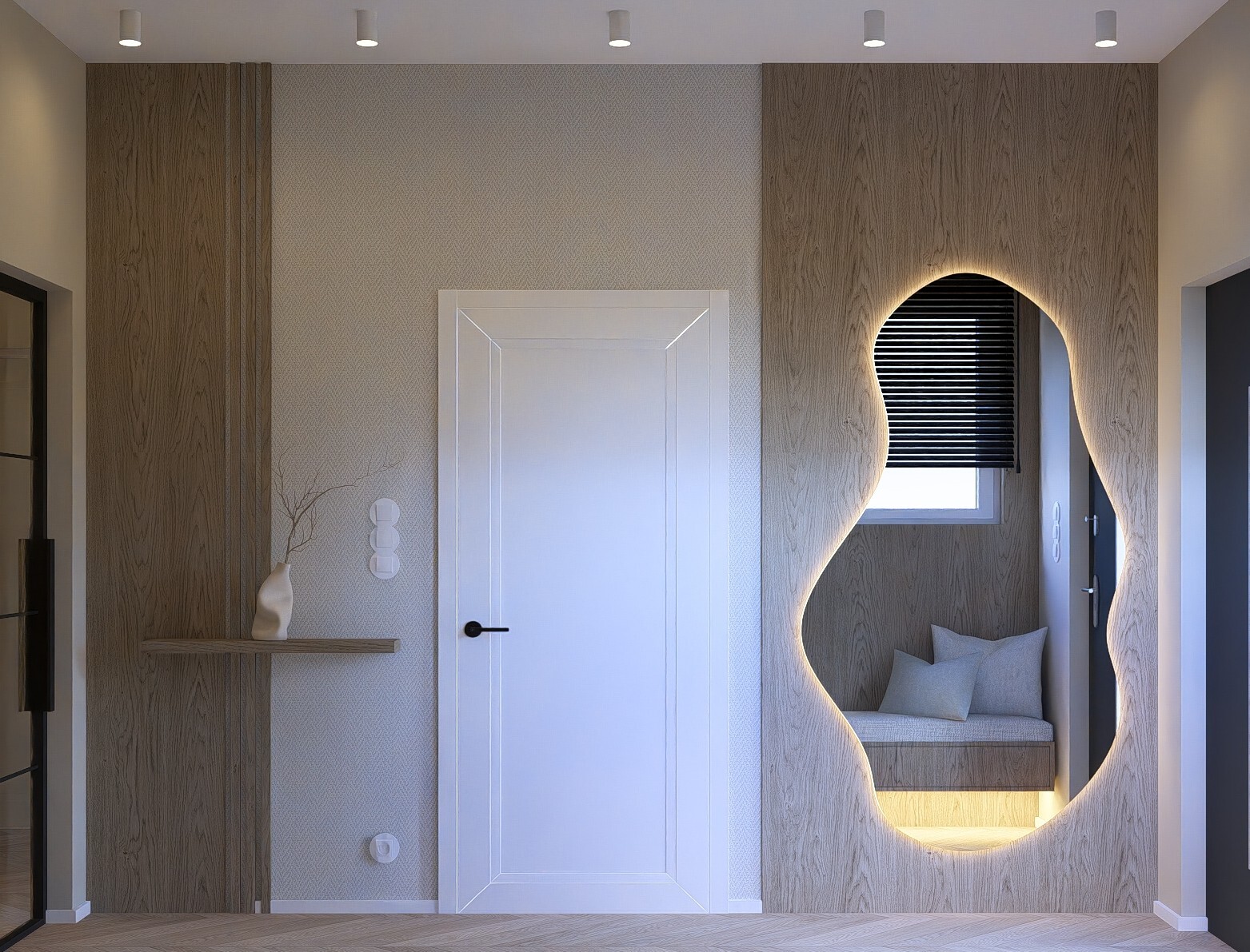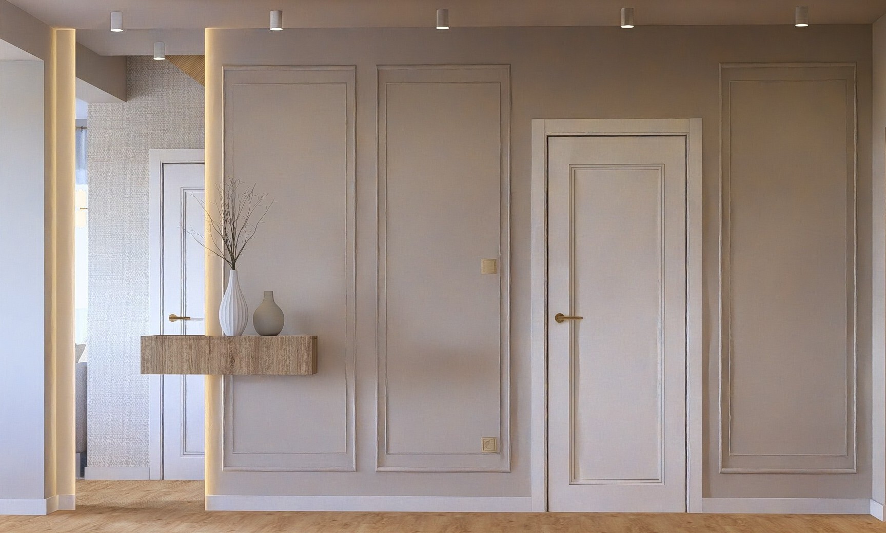 Koncepcja salonu z kuchnią, jadalni, wiatrołapu i korytarza w domu jednorodzinnym w Bielsku Podlaskim